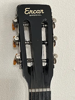 He has (and now I have purchased) a 1930's Ercar guitar. That's what it looks like. It could also be Encan, but I don't think so. I can't find anything online about them whatsoever. The man had a video of himself playing the guitar, so I know it will be playable and not just a beautiful ornament. This guitar is handmade by a luthier. I would have loved to have his or her name, but alas, it is not to be. You can tell, however, that it is handmade, which is even more rare and wonderful.