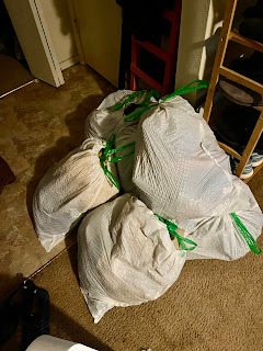 The sweaters were easy to chunk. I had most of them, if not all of them for several years. I think I kept four. I filled six big trash bags full of blouses, sweaters, long and short-sleeved tee shirts, and two note-worthy pairs of cowboy boots. I never had a pair of fake cowboy boots - - both pairs were Justin and they were working boots; truly broken in. Someone will love them, I'm sure. Hopefully, someone and a few someones will enjoy the clothes, and they'll pay a little something for them so that the good folks at Goodwill benefit from having them in their store.