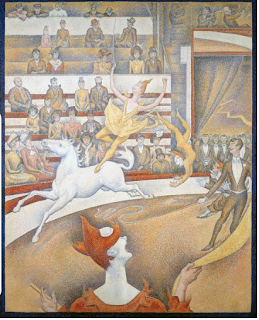 I'm not exactly writing two books at the same time, but I am allowing one to bleed into the other. I shouldn't use the word "bleed" but it is a murder book series, right? Nick Posh will find himself in the mesa...in the desert, chasing down the clowns and horses who (and that) lead him to other cases and casks. If you know anything about art you'll enjoy the "find" out in Vegas. It's an original Seurat painting; one no one even knew existed. The 31-year-old artist died in the late 1870s before either Nick or his friend Ralph Ferguson were born. Why the interest?