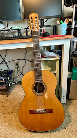 There is another person online with an Aria made in 1978 and they're asking $500 for it. Wow. I feel pretty good about my little investment. The scuff on his face tells me he's been around. He's been in a situation or two. Maybe he was played in bars and was used to defend his owner at some point? Who knows. He's an amazing instrument, and I'm about to have him professionally cleaned, restrung, and tuned. He'll come home and be played at least 3x a week.