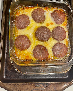 After the egg/butter thing you grate or add shredded cheddar. This time I used white cheddar. You can do whatever your heart desires. I grate enough to cover the top lightly. Then I add the sausage. Sometimes, I tear it up, and other times, I don't. The one in the picture only has 8 patties, so if I was serving 9 people that would be a problem, but this only served four since we like to eat it, and 8 can be divided by 4 pretty good.