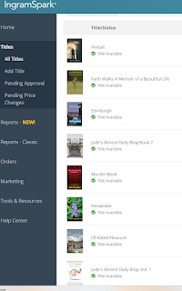 With Ingram Sparks, I have 8 books published and ready on Amazon in about a week's time. Two are romance books, two are murder books, two are blog books, and one is a biography while the other is a poetry book. I'll say this, I'm pretty happy about it. I don't like that one of my romance books, Edinburgh, is a 5x8 rather than a 6x9 book, but again, it was something I did, not them. I didn't want to mess it up further by trying to redo the PDF. It also has 2 random blank pages in it; both follow the end of a chapter, but it is upsetting that it's a full blank page and I can't remove it. I mean, I may figure out how to do it, but I don't want to mess up the interior.