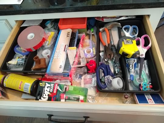 I looked into my first kitchen drawer and made a list of several things I have. We all have these things in our junk drawers. Pens, pencils, Sharpies, tape, wrapping ribbon, twine, scissors, a tape measure, pencil sharpener, nail file, batteries, measuring tape, bookmarker, watch, chain, flash drive, cards, dice, sewing kit, highlighters, wire, glue, a ruler, a lighter or two, and some other stuff. You get the picture. In the OTHER drawer, the one I say has the useful things, I have screws, tools, a hammer, more scissors, more glue, a corkscrew, electric hand blender blades, a small socket set, and a knife sharpener...and other stuff.