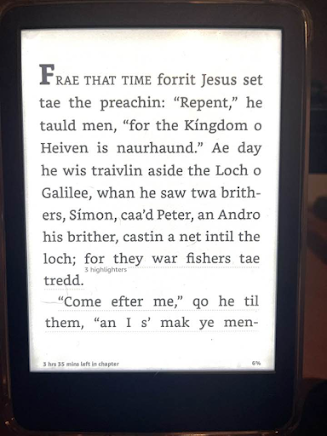 I'll post a single page from my Kindle so you can see what I'm talking about; you'll have to try it. I bought the New Testament in book form about four years ago, and I've been learning to read it faster and faster. It took me months to get past the first 10-15 pages. I was constantly looking up words to see what they meant, and then I'd read it again and again and try to do it without stopping. After as much time as I've put into it, I can say that I can read the Scots language so much better than I used to, and I wish I could speak it. I really do. I pull out a word now and again, but I don't have it down like I want to. Ay canna dae it. But I do try.