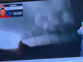 We start thinking about those we love, and what they're doing; whether or not they're home and safe. We text them all of course, warning them that there's activity. They text back and say they're watching too; most watch Channel 9, but there are some that watch others too -- hopefully, we're all getting the same information. The tornadoes we had today, plural, were all in a straight fixed line from the top of Texas all the way through to Kansas, and they went all the way from the western borders of Oklahoma to the eastern borders before they were finished. Sometimes the funnels came down, but for the most part they remained up in the clouds.