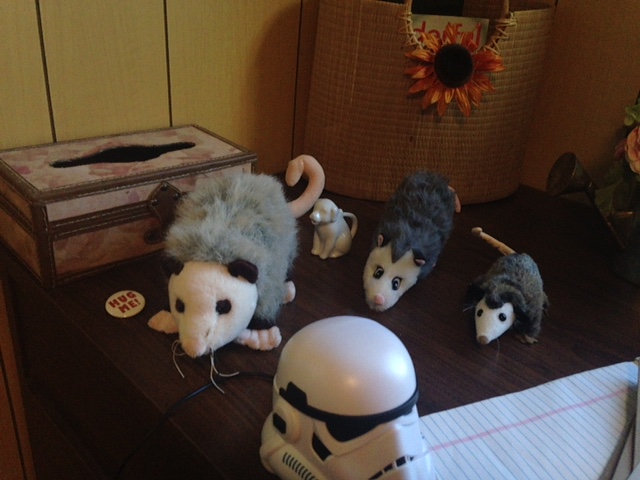 My possum family from Naked Tails. One came all the way from Canada with TD O'Malley. Oh, and my "Hug Me" button from last year's GRL.