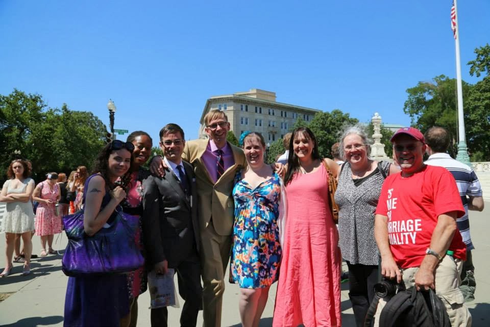 It was the craziest, busiest, most exciting, wonderful whirlwind of a wedding I could ever have imagined. We participated in an initiative this past June sponsored by Marriage Evolved called C-Bus of Love. Along with 24 other LGBT couples, we rode a bus to Washington DC and exchanged vows in front of the Supreme Court building – just days before the historic DOMA decision. We were told that we wouldn’t be allowed on the steps because public demonstrations are not permitted there. So the ceremony was held on the sidewalk in front of the building. But some of the security guards who watched us said they were so moved by what they saw that they were going to bend the rules and allow each couple to walk up inside the Supreme Court building and emerge through the front doors so that we could walk down the steps together to introduce ourselves as spouse and spouse. It was a profound moment for us, and I’m so glad that we were able to be a part of making an important statement for marriage equality.