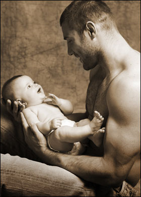 A sepia tone photograph shows a handsome man, bare-chested, who sits cradling a baby in both hands. He has short hair and a muscled body, and he gazes adoringly at the baby.