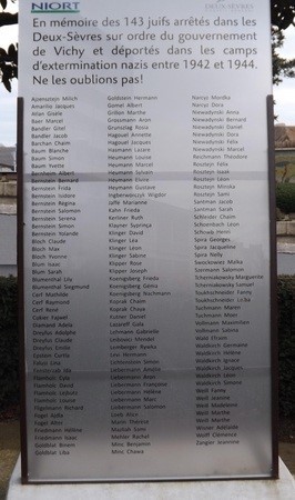 Stèle unveiled on 03/02/2012 - station area, at the corner of rue des Trois-Coigneaux and avenue Charles de Gaulle - "In memory of the 143 Jews arrested in the Deux-Sèvres by order of the Vichy government and deported to the Nazi extermination camps between 1942 and 1944. Do not forget them!" Of the 143 deportees, 4 survived: Gisèle ATLAN, Yvette BAUM, Ida FENSTERZAB, Leon ROSZTEJN.