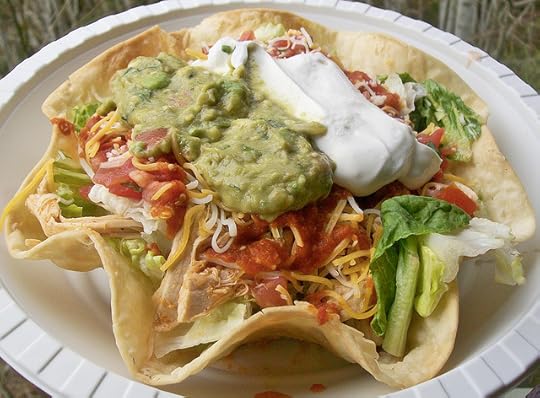 • Taco salad in that crazy giant taco bowl. Whoever invented this magically delicious dish deserves some props for making a fat exploded taco sound healthy. Come on, this is just a salad, people. Get some greasy enchiladas and a bowl of deep-fried ice cream to finish off your meal.