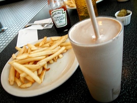 Milkshakes must be made from just ice cream and milk and poured from a giant metal cup into a really heavy glass. The metal cup should have more milkshake left over and get all frosted up before you pour the deliciously creamy bubbles-n-lumps mixture into your glass. All fries should be thick cut, slightly brown with dirty grease flavor, and served wet and glistening. Ketchup should be from a half-empty glass bottle only with ketchup smears all down the insides. You must sit at the counter on a swivel-chair that has rips in the orange or brown vinyl padding and lean up against a really smooth counter that has little sparkles in it from the 1950s.