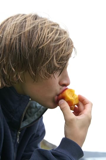 It starts when you pick up the peach and notice it’s dark orange and pink and dented all over. “Here we go,” you say to your buddies down at the bus stop, planting your feet in the ground, steadying your grip.