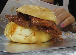 Old ladies wearing frilly aprons and dark black glasses deep-fry pancake-sized breaded chicken breasts till they’re brown, crisping, and dripping with hot oil. Then they place them neatly on big doughy buns the size of cabbages, pour ladles of fresh steaming tomato sauce on top, toss some cheese and mushrooms on there, and wrap the sandwich in a mirrory foil before handing it to you with fifty thin paper napkins and a grunt.