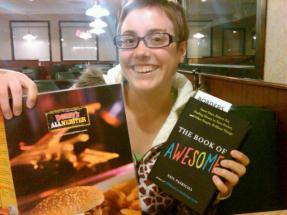 “After finding your blog 2 months ago and reading it daily I finally made it to the store to buy The Book of Awesome. Also on the agenda that day was meeting up with a friend i haven’t seen for 8 months. So our supper was me saying: ‘because of this blog and this book i’ve decided to live the awesomest life ever! This is my new handbook!’ It’s awesome inspiring people to live a better and richer life by appreciating the awesomeness they experience daily. I hope there’s a Book of Awesome 2 in the works! p.s. for dinner I went for the AWESOME Denny’s Slamburger, a late night special!” – Alyssa