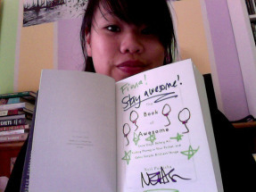 “Hi Neil, It’s nice to be able to put a face to the author of 1000 awesome things! here is my “awesome” that i wrote down last night at the book of awesome launch: Finally tagging the person that you’ve been playing phone tag with. Cheers, Fiona.”