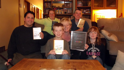 "My family and friends absolutely LOVE your 'AWESOME' books! When friends come to hang out they never listen to what I'm saying, or watch the movie we are supposed to be watching, because they are always hunched over the coffee table reading your books. So much so, that I had to buy your books for them all. Then I took a Book of Awesome to the seniors home where I work, and read it to the seniors. Then my daughter took a book to school and never brought it back because the school is reading it. So now our family is writing our own personal Book of Awesome which friends are now contributing to. Here's to awesomeness and an end to all things negative! From left to right we are: Andy, Julianne, Jonathan, Anne, Stuart and Kimberley. Hey, that could be another 'awesome' idea…. "When everybody looks at the camera and smiles at the same time!" – Anne