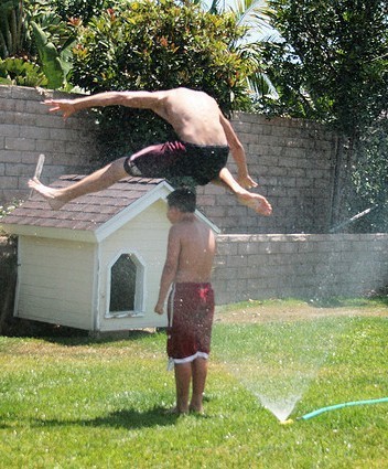1.The Original. Get the sprinkler sprinkling and motor at it full throttle before jumping as high as you can right through that wall of water. No fear.
