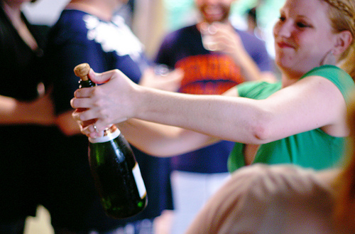 Yes, he bent over the bottle, gritted his teeth and twisted, and managed to shoot that cork like a speeding bullet right smack off his forehead. He stared up with his mouth forming a giant O of shock as bubbles foamed up and dripped on the carpet and a painful dark red bruise slowly formed right between his eyebrows.