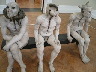 If anything, a viewer’s possible initial response of revulsion and macabre fascination, may lead to the sense that these entities pose a very real threat thanks to their powerful, well-defined musculature and positioning that give semblance to the potential of sudden movement made frightening by the unholy addition of horns. Their eyes, too, set them apart – dark and liquid, like that of an animal, possibly unthinking, fearful and feral. Their sickly, clay-like complexion suggests a skin tone that is neither black nor white, but is neutral and possibly diseased, even. Darker blemishes on their necks and by their damaged spines are suggestive of weeping wounds that have not healed. The figures represent an anomaly – constructs that should not be, like Frankenstein’s monster, composite beings made up of the discarded parts of others. Through a process of dehumanisation, these once well-proportioned human individuals have become perverted effigies; their physical bodies have been twisted into a parody of mankind by their taking on of bestial qualities. This is summed up by John Peffer, who writes, “Through the graphic distortion of the body and its metamorphosis into a beast, artists posed trenchant questions about the relation of corporeal experience to ideas about animality, community, and the sacred.” (Peffer 2009, p. 71) Alexander’s The Butcher Boys, through the addition of animal horns, bestial eyes, removal of ears, emasculation of the genitalia, and muting of the mouths, in addition to mutilation of the spine and throat, are a discomforting blend of human and animal that cannot simply be ignored. The choice of incorporating animal horns into the sculpture not only suggests the bestial metamorphosis akin to the Minotaur in its ancient Cretan Labyrinth – the product of a transgression against nature and the gods – but considered in a largely Western (and Christian) context, is also suggestive of the diabolical.