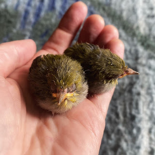 On Sunday, I had one of Those Phone Calls from an unknown number. "Hi, I've found some baby birds..." It's the kind of call that makes me despair. Because those words are usually followed by "I've got cats" or "I've got a dog". And for whatever reason the babies cannot be reunited with the parents or returned to the nest.