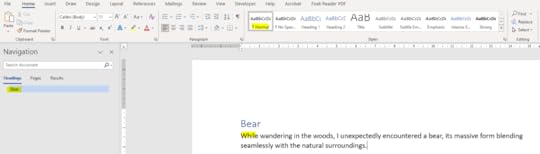 Next, we have target the Heading and writing formatting. Go to ‘Home’ and use ‘Styles’ it will help you a lot when you want to change formatting. Whatever you want to change, it will be applied throughout the whole document which you have previously selected as Heading 1/Normal. Rule of thumb, ‘Normal’ for writing and select ‘Heading 1’ when you starting a new title/chapter. Example: Select the words ‘Bear’ and click onto ‘Heading 1’ and the paragraph below select ‘Normal’. Another good thing when you are selecting these style is that when you can see on the left, Word will have show the list of headings in your work/book.