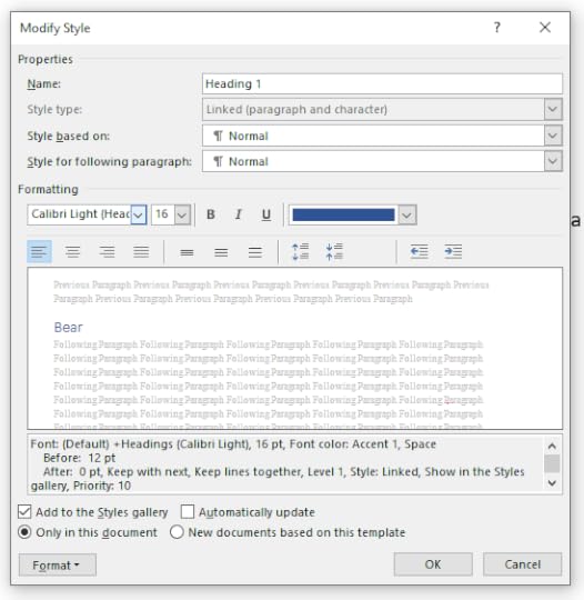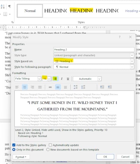 *One more thing, if you didn’t see all your headers appearing – you can change the formatting at the doc./docx. (change all your Headings 2/3 formatting to Heading 1 (same size/font etc., see below on how to change)) (click onto Heading 2 and then click modify : go to ‘Style based on:’ change from Normal to ‘Heading 1’. When everything is set the same as Heading 1, select ‘Ok’. I want all my headers to appear in the eBook for easy access as compared to the paperback i.e. one chapter, multiple sub chapters within that chapter. However for eBook all the chapters/sub chapters will become a header here so that the reader can easily go back to the previous chapter that they wanted to reread.