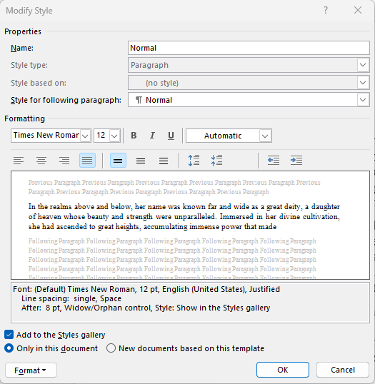 Opt for Simplicity and Legibility: On their website I didn’t see Amazon stating specific font type but still advisable to employing straightforward fonts like Arial, Calibri, or Verdana for your eBook main body. These ensure readability and minimize formatting glitches. [I am using Times New Romans (TNR), as I think that is the most standard format. It’s still acceptable to use it, no worries].Size Matters: Maintain a font size of no less than 12 points for your ebook’s main text. This promotes comfortable reading across various devices and screen dimensions.Structured Navigation: Utilize clear headings and subheadings to compartmentalize your eBook into coherent segments. I recommend using heading fonts of 16 points and subheading fonts of 14 points and ensure to use the Styles guide mentioned in the previous post so that you can modify easily if you needed to change anything.Margins for Space: Employ a margin of at least 0.75 inches/2.54cm (standard margin layout) around each page to guarantee both a reader-friendly layout and a professional aesthetic.Breathing Room for Clarity: Apply proper paragraph spacing to enhance visual appeal and readability. Allow a spacing of 1.5 times the font size between paragraphs. I use zero before and after indent as I already set the 1.5 spacing beforehand. If I added any extra points eg. 6 pt to the Headings, it will have to much empty space. (However, this is just my personal preference).Following these guidelines ensures your work appears professional and ensures an enjoyable reading experience for your audience.