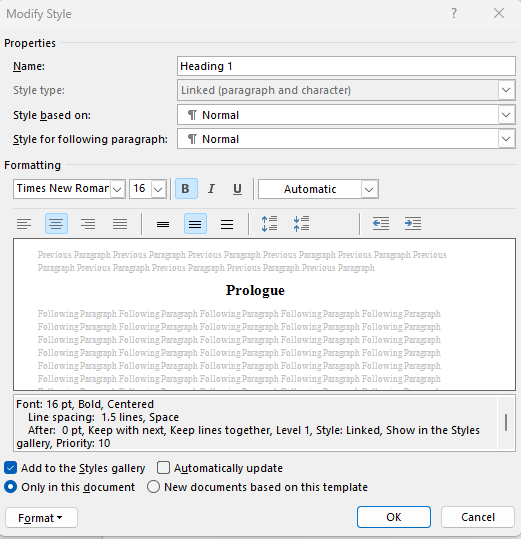Below will show. Change it to the formatting you want for your book. My Formatting/What I like to use (Heading 1) :