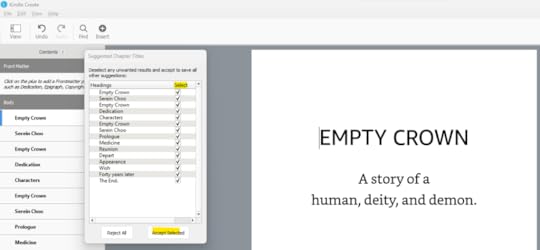 It will auto prompt to create a Table of Contents for you as shown. However, not all the Chapters are captured correctly and the pages that you made previously like the title page, copyright etc, you can exclude those manually by clicking in ‘Select’ column and tick and untick the specific boxes that you want. After you are done, select ‘Accept Selected’. If you clicked on ‘Reject All’, you will have to manually create the Table of Contents, thus I advise it’s better if you allow the program to auto create then you choose which one you want to remain and continued (don’t worry, after creating it you can still edit the table of content to your liking).