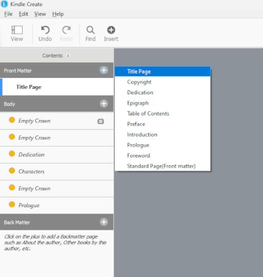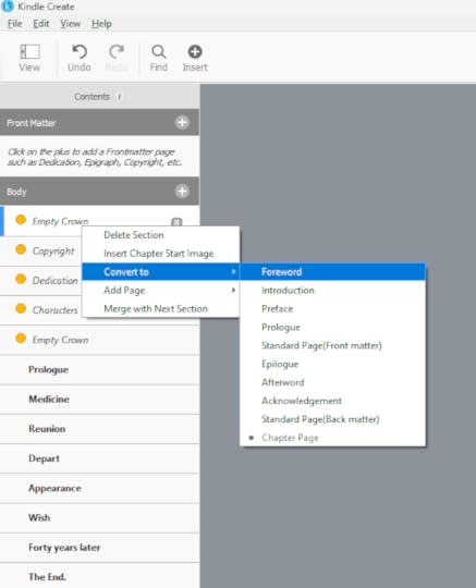 Using the convert to button, I change the the previous headers like “Empty Crown”, “Copyright” etc to the Front Matter. Did it matter where I put them (Front Matter or Body)? When I was previewing, I didn’t see any difference. As long as there’s an orange circle on the left, it wouldn’t be consider as part of the Table of Content. I just did it for my own satisfaction.