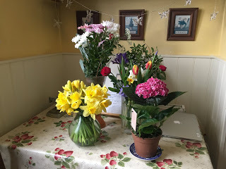 In other news, younger daughter is home between cruises and tours, although she's been dashing around seeing people and getting things done, including a holiday in South Africa with her Uncle Roger (best man at my wedding). Elder daughter is still being a mother and singer going all over the UK and doing an Open University degree. Elder son is still living round the corner and doing what he's always done - leading his own band and helping friends with building projects to top up the finances. Younger son is, as I've said, getting married and his first book will be published later this year. No - he isn't following in my footsteps - it's on popular philosophy. I'll show you the cover when he allows me to. Meanwhile here are the floral tributes I received on Mothers Day.