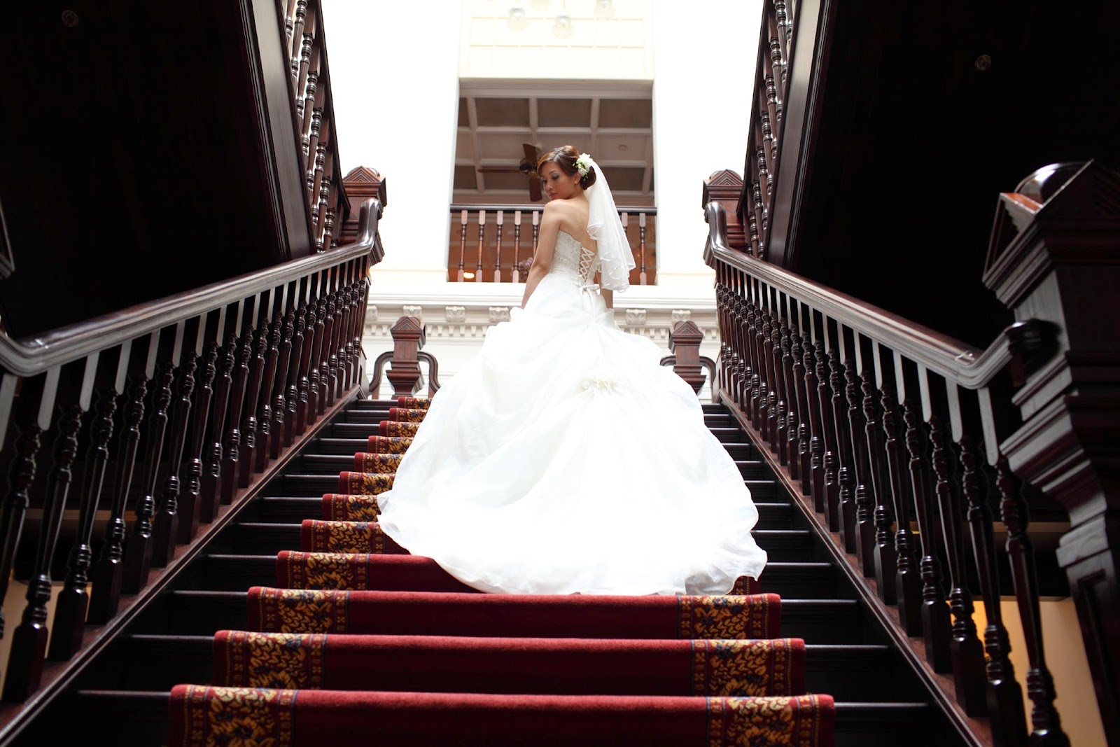 The bride on the staircase at the Raffles Hotel