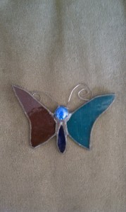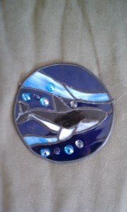 This is the suncatcher I made–just like the ones which hang in the window of the library on the Island in STAINED GLASS SUMMER. The second picture is the more advanced piece I made.