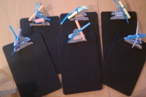 It’s a simple project. You take a clipboard. Apply a couple coats of black chalkboard paint, and attach colored chalk to colorful ribbon. I added the words on the top of the clipboard to go along with the workshop. The directions for making the chalkboards can be found here.