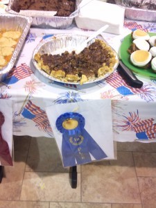 I'm going to have to update my author bio to include a new honor: champion dessert maker! They had a dessert contest at the church cookout this weekend, and I brought my chocolate pecan pie. Of course, I hoped to win, but I didn't really expect to. After dropping off my pie at the fellowship hall, I got completely sidetracked by having to learn the new music for the service and being one of only two sopranos, so I was having to sing nice and loud. Then after church I went through the serving line, got my burger and was getting settled at a table when someone congratulated me. When I didn't know why (I thought maybe it had to do with singing last week or what we'd done in the service that day), she dragged me to the dessert table, where there was a blue ribbon on my pie.