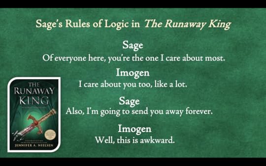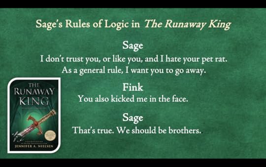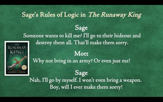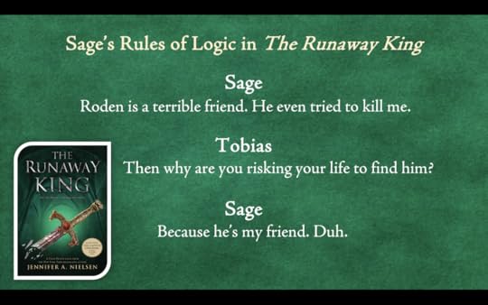 For now, today features THE RUNAWAY KING! What I love about this book is that we get a better look at Sage’s logic. He has his own way of viewing the world and doesn’t much care if anyone else sees it the same way or not. But it does lead to perspectives like these…