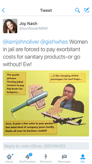 I was floundering around for an idea that wouldn't be completely inappropriate--I mean, what's funny about social injustice?? Nothing!! I happened to read an article about a female judge in Kentucky who was appalled when a woman came into her courtroom with no pants, because she couldn't obtain feminine sanitary products in jail. Ugh!! I can't even imagine. I did a little research and found out that this is a disgustingly common problem, one that is actually exploited for profit by for-profit prisons, who, just because they can, will charge high prices for these basic female necessities to women who clearly can't afford even the regular prices.