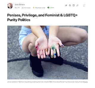 Here is the no paywall link, so you can readily share it with others: https://juliaserano.medium.com/penises-privilege-and-feminist-lgbtq-purity-politics-bafd1f25fe3e?sk=5098f46767404745b65d298b79aa8066
