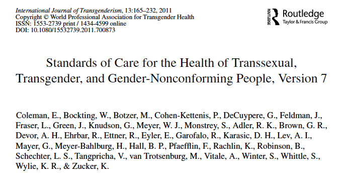 WPATH's SOC7The World Professional Association for Transgender Health (WPATH) has said as much in their most current Standards of Care (SOC) for the Health of Transsexual, Transgender, and Gender Nonconforming People (version 7). A PDF of the SOC7 can be downloaded here. The passage in question can be found on page 175, and it reads as follows: