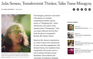I was interviewed in the New York Times as part of their Pride 2017 coverage - the article is called Julia Serano, Transfeminist Thinker, Talks Trans-Misogyny . You can read it via that link; if it's behind a paywall, here is a PDF version.