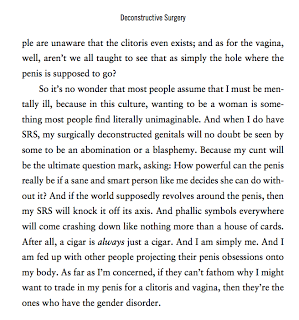 Fast forward to this week: Herzog sent me an email with a link to the article and mentioning that my essay was quoted in it. I was too busy writing/publishing/getting word out about my latest essay (Debunking “Trans Women Are Not Women” Arguments) to read it. But in the last 24 hours or so, I've seen lots of negative reactions to it, and people are now asking me about it (since I am quoted in it). So I read it tonight, and here are my initial thoughts upon first reading: