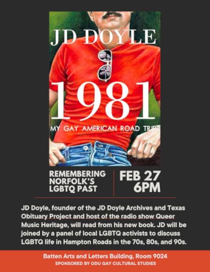 "It's at ODU (Old Dominion University) on Tuesday, February 27 at 6 pm. I will be joined by panelists Scott Wyatt and Charles Ford to discuss gay life in Norfolk and the surrounding areas in the 70s, 80s, and 90s. Hey, Scott's in the book!