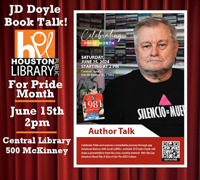 I've been asked to talk about my book— 1981—My Gay American Road Trip —at the Houston Public Library. It will be a reading, with slide show and Q&A.