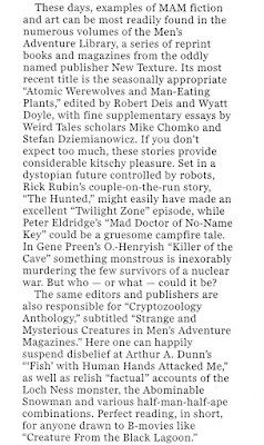 "The book itself is simply gorgeous, but that’s to be expected by this point in our relationship with these editors. Lavishly illustrated with many covers reproduced in full color, this is essentially a coffee table book dedicated to 'when men’s adventure magazines got weird,' as the cover’s subtitle aptly describes. I also appreciate the effort that has gone into identifying the artists whose work adorns the covers and interior illustrations; all in all, this book is an effort of pure love for the genre."