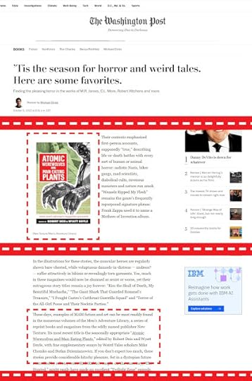 Michael Dirda of The Washington Post praises The Men's Adventure Library collections Atomic Werewolves and Man-Eating Plants and Cryptozoology Anthology in today's edition.