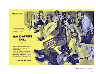 A lifelong New Yorker born in 1931, illustration artist Samson Pollen enjoyed early success as a cover artist for paperbacks before moving into magazine illustration in the mid-1950s. Almost all of Pollen’s magazine pieces were commissions for Martin Goodman’s Magazine Management Company (publishers of some of the best and longest lasting MAMs, from the ’50s through the ’70s, and birthplace of Marvel Comics). Interior two-page spreads, created under the direction of the art department, were his specialty.