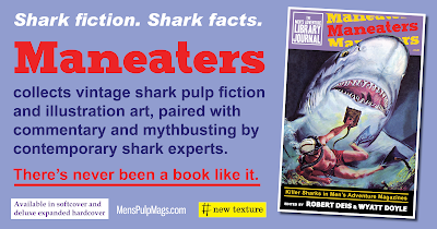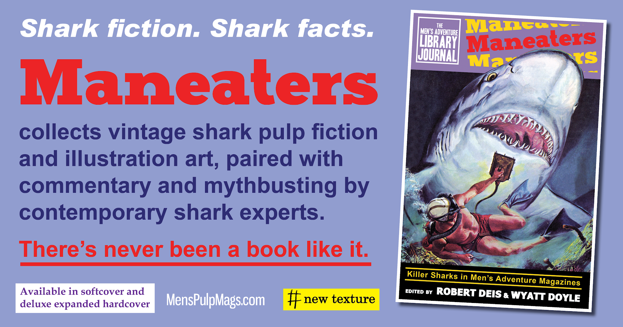 Summertime. When thoughts turn to sun, sand, surf...and sharks! Just in time for beach season, Men's Adventure Library editors Robert Deis and Wyatt Doyle present Maneaters, a deep dive into long unseen shark-themed pulp fiction and savage full-color illustration art drawn from three decades of classic men's adventure magazines (or MAMs), most out of print since their original publication. In addition, these graphic, action-packed tales of shark encounters are paired with commentary and mythbusting by a celebrated panel of contemporary shark experts who separate the stories' fact from fiction.