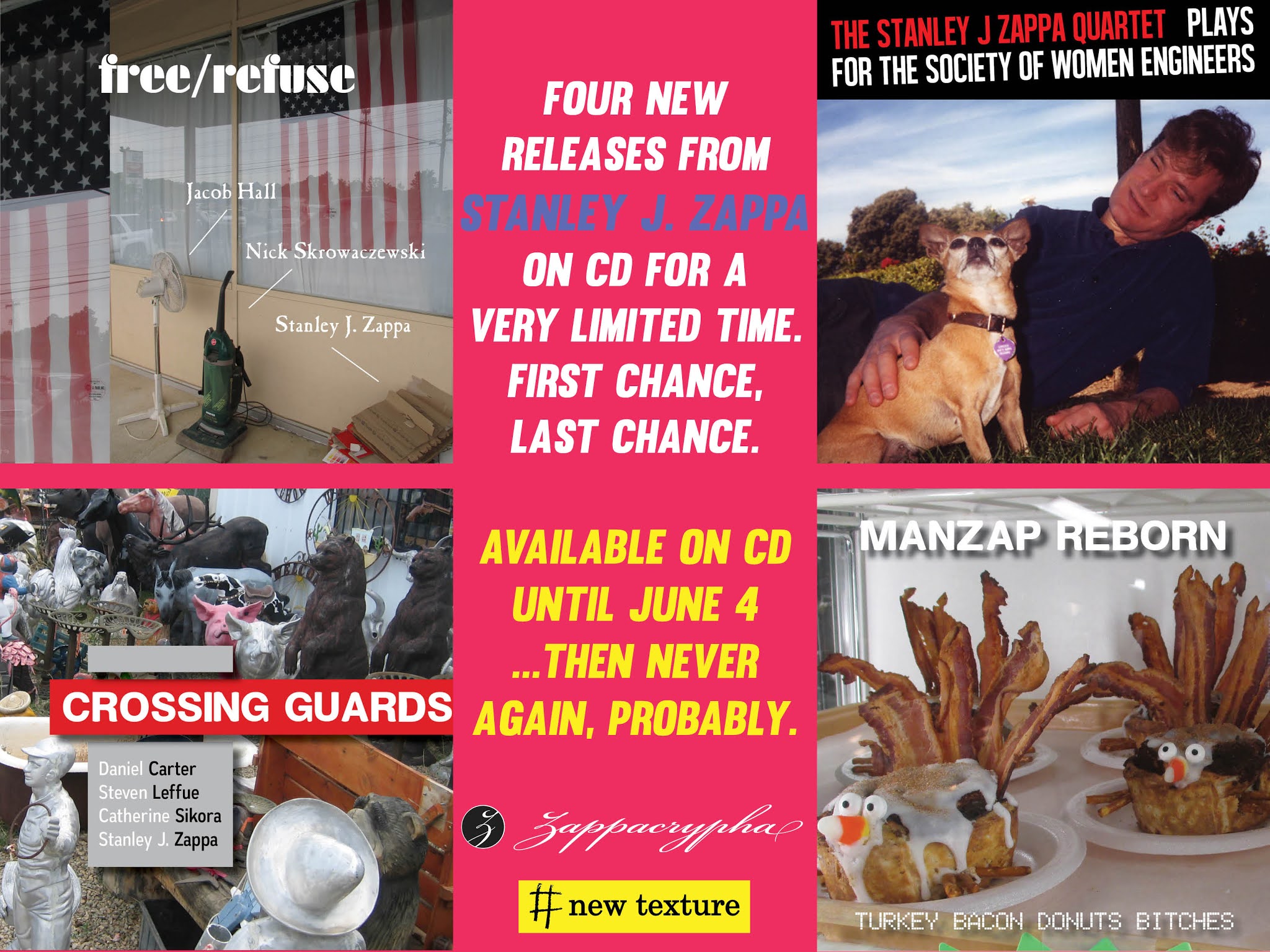 We’re releasing four new CDs from Stanley J. Zappa (and friends). They are available right now from Amazon. They will only be available to purchase until June 4th, a matter of days. We had hoped to stagger these releases and keep them in print indefinitely, but our manufacturer has rather suddenly announced other plans about manufacturing them. (It’s Amazon, and they are assholes.)