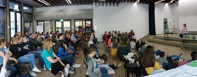 À minha espera estava uma sala cheia de um público caloroso de jovens e adultos...