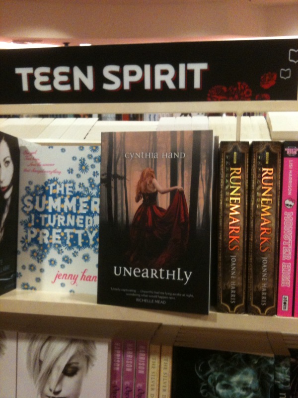 First, Unearthly is on the shelves in Australia! I vaguely knew about this, but yesterday I was pleased as punch to receive these photos from a fan, showing my little book on the big bad shelf. Here they are: